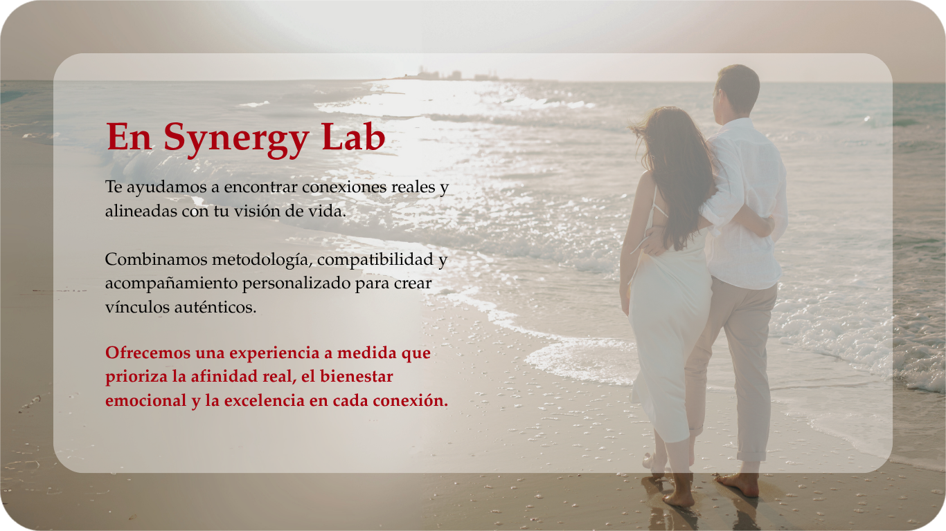 Aquí no hay matches automáticos ni conversaciones vacías. En Synergy Lab hay acompañamiento humano, enfoque terapéutico, crecimiento personal, selección personalizada y una comunidad basada en valores. Synergy Lab es un espacio diseñado para quienes están trabajando en sí y quieren relaciones conscientes y significativas.